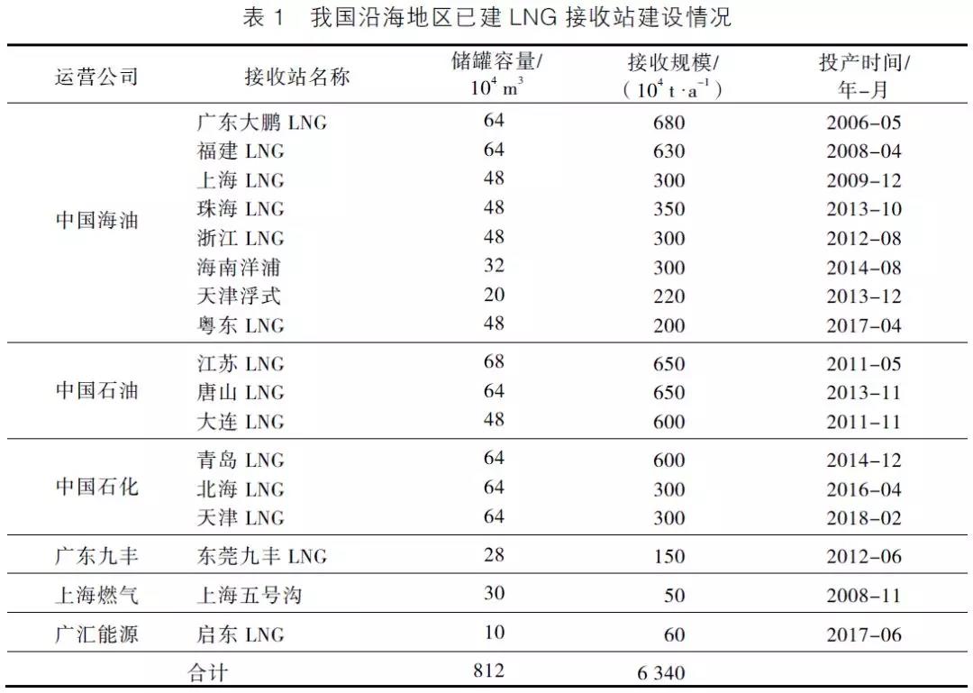 截至2018年2月,我国东南沿海已建成17座LNG接收站,储罐容量812万m3,总接收能力达6340万t/a,分别由中国海油、中国石油、中国石化和部分私营企业投资建设。其中,建成最早的LNG接收站是广东大鹏LNG接收站,最新建成的LNG接收站是中国石化天津LNG接收站。各接收站建设情况详见表1。
