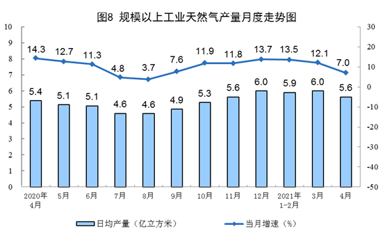 1—4月份,生产天然气702亿立方米,同比增长11.6%,比2019年1—4月份增长23.1%,两年平均增长10.9%。